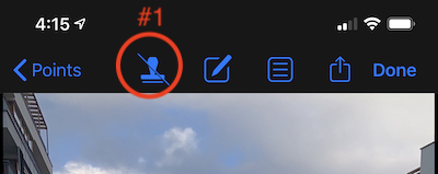 स्टैम्प की गई फोटो देखने के लिए, वर्तमान नोट्स और वैकल्पिक रूप से वॉटरमार्क (सेटिंग्स के अनुसार) लगाए गए फोटो को देखने के लिए, उस स्टैम्प बटन (#1) पर टैप करें: