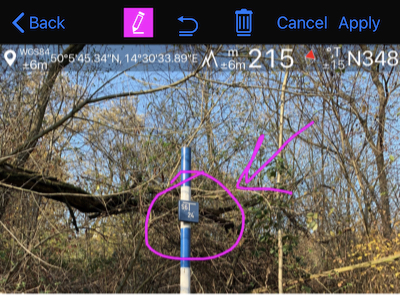 आप “नया वेपॉइंट” मेनू आइटम के अंदर एक नई कैमरा बटन पाएंगे। यह बटन एक कैमरा स्क्रीन खोलता है जो स्थान, तारीख और नोट्स ओवरले के साथ फोटो लेने की अनुमति देता है: