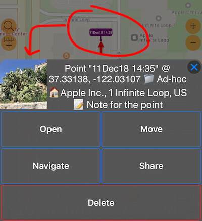 मानचित्र पर एक पॉइंट पर टैप करें और इमेज प्रीव्यू के साथ मेनू खोलें, यदि पॉइंट में एक इमेज जुड़ा है:
