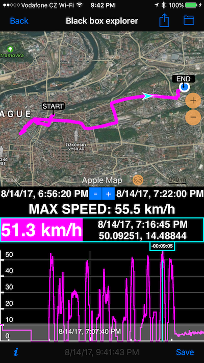ब्लैक बॉक्स आपकी यात्रा के अंतिम 1800 GPS बिंदुओं को संरक्षित करता है। इसमें एक बिल्ट-इन iPhone और सेलुलर iPad GPS रिसीवर है जो आपकी यात्रा के अंतिम 30 मिनट को कवर करता है (पहले संस्करण 1.8 से पहले 1200 बिंदु और अधिकतम 20 मिनट थे)।