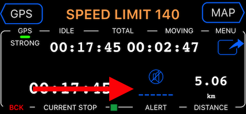 इस मोड में, TIME पैनल आराम/चलने के समय मॉनिटर दिखाता है और वर्तमान रुकावट की अवधि के लिए अलर्ट सेटअप करने की अनुमति देता है। डिफ़ॉल्ट रूप से, अलर्ट अक्षम है। TIME डैश में ALERT लेबल के ऊपर @"——-" बटन पर टैप करें ताकि अलर्ट सेटिंग्स खोल सकें: