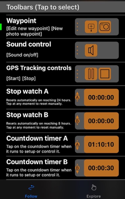선택한 옵션은 속도 화면과 지도 화면별로 별도로 설정되며, 지도의 “내 위치 추적” 및 “탐색/편집” 모드별로도 별도로 설정됩니다. 동일한 도구/측정값을 사용하려면 동일한 옵션을 선택하면 됩니다. 이를 통해 각 상황에 가장 적합한 도구/측정값을 사용할 수 있습니다.