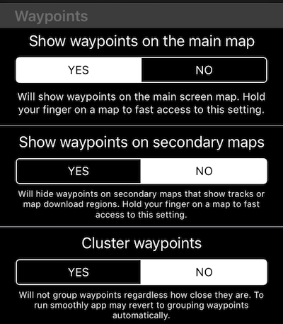 메인 또는 보조 맵에서 웨이포인트를 표시하거나 숨기고, 웨이포인트 그룹화를 비활성화할 수 있습니다(기본값으로 활성화되어 있음):