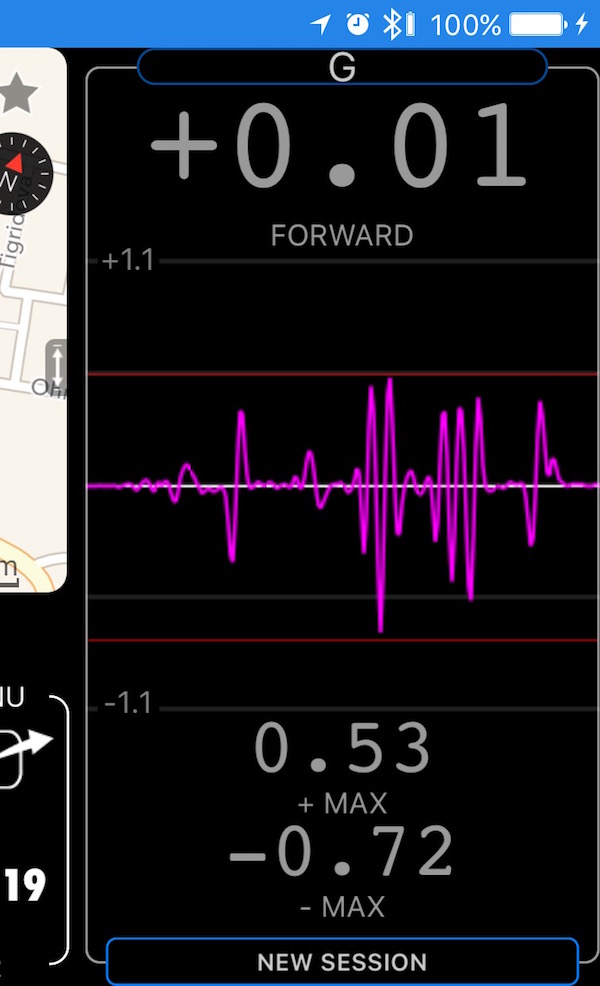 Aktywuj przez MENU>MODES>“Monitor G-Force” (lub przez siłę dotyku na ikonie aplikacji -> Tryby)