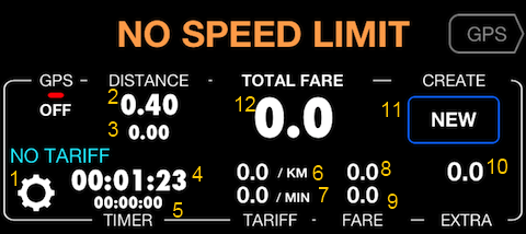 Widzisz, że wszystkie liczniki zostały zresetowane, a podróż jest wstrzymana (obrazek pauzy #14 miga). Możesz rozpocząć podróż przyciskiem #15 lub zatrzymać flagą #16. Indykator śledzenia #19 pokazuje, że została utworzona nowa ścieżka dla tej podróży taxymetrem (nie jest to istotne dla nas).