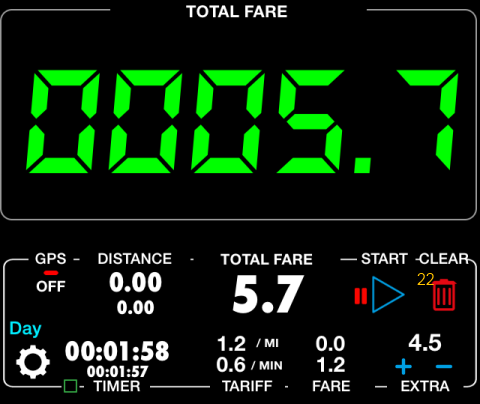 Po naciśnięciu ekran taxymetru wygląda tak (pamiętaj, że liczbę miejsc po przecinku dla dużych cyfr kosztów można zmienić dwukrotnym naciśnięciem):