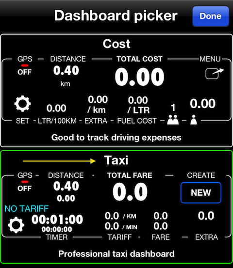 Naciśnij opcję “Taxi dashboard” (jej obramowanie zmieni kolor na zielony) i wróć do ekranu głównego za pomocą serii przycisków “Done”.