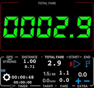 Widzimy, że licznik prędkości zaczyna się od 0,00 przejechanej odległości i pokazuje -0,29 mili w polu odległości rozliczanej. To informuje nas, że jedziemy przez odległość wliczoną w taryfę minimalną. Podczas jazdy odległość rozliczana zmieni się z wartości ujemnej na zero, a dopiero wtedy zacznie się naliczać opłata za odległość powyżej taryfy minimalnej. Oto jak wygląda taryfa po przejechaniu 1 mili: