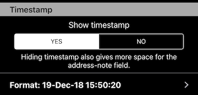 Zaman damgası alanı gizlendiğinde, adres-not alanı için daha fazla alan sağlanır. Bu yeni seçenek Ayarlar > Kapture ayarları > Zaman damgası bölümünde yer alır: