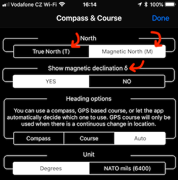Hem gerçek kuzey hem de manyetik kuzey için hangisinin kullanıldığını ve sapmanın ne olduğunu açıkça gösterir. Hem mevcut konumunuzdaki hem de haritadaki herhangi bir noktadaki sapma. Varsayılan olarak sapma gösterimi kapalıdır ve Ayarlar > “Pusula ve Yön” sekmesinden açabilirsiniz: