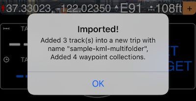 Việc nhập .kml hỗ trợ các thư mục lồng nhau, nơi các điểm đánh dấu (placemarks) trong mỗi thư mục và thư mục con của kml được đặt vào một bộ sưu tập điểm đánh dấu mới riêng biệt trong ứng dụng. Dù tiêu chuẩn Kml không nêu rõ “hành trình” là gì, sau khi nhập, bạn có thể đánh dấu bất kỳ bộ sưu tập nào là một hành trình. Các điểm đánh dấu chắc chắn được nhập theo đúng thứ tự chúng được sắp xếp trong mỗi thư mục kml.