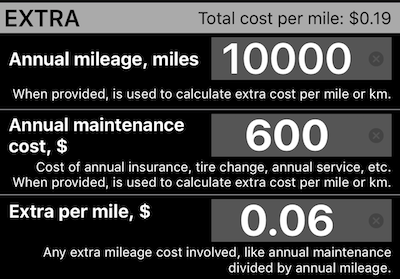 Sẽ rất tuyệt nếu giá trên mỗi dặm hoặc kilômeter chỉ dựa trên giá nhiên liệu. Nhưng trong thế giới thực, chúng ta còn phải trả bảo hiểm, chi phí bảo dưỡng hàng năm và thay lốp hai lần một năm ở các khu vực lạnh. Tất cả những điều này cộng lại và thay đổi giá cuối cùng cho mỗi dặm/kilômeter mà chúng ta lái. Trong phần này, bạn có thể thiết lập phần chi phí hàng năm để điều chỉnh tổng chi phí trên mỗi dặm/kilômeter: