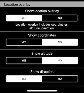 除了隱藏整個位置覆蓋層外,您現在可以選擇隱藏覆蓋層中的座標、海拔或方向部分。設定 > 拍攝設定 > 位置覆蓋層區段: