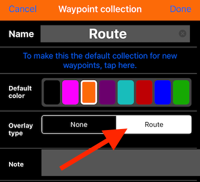開啟集合設定畫面(MENU > WAYPOINT COLLECTIONS 並點擊集合列上的設定按鈕),將其「Overlay type」設為 Route: