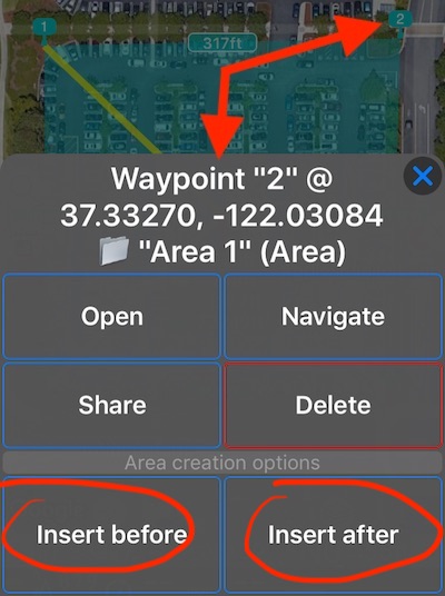 上圖顯示點擊區域點會顯示「插入前」和「插入後」的選項。路線點也提供相同的選項。