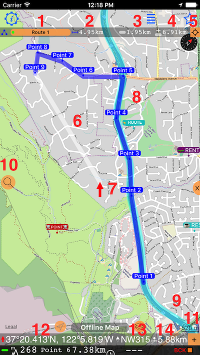 #13 - 地圖旋轉的角度。在此非居中模式下,您可以隨時用兩根手指旋轉地圖,使其處於最方便的角度。