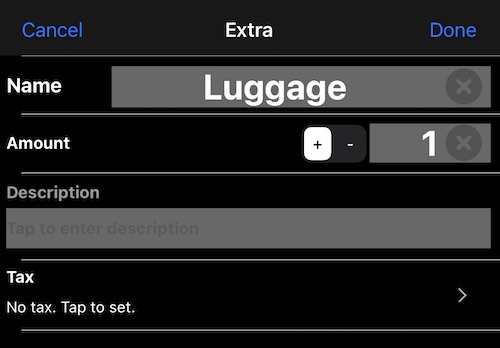 您可以輕觸「任意金額」來新增任意金額至總費用,或因為行李費用較常使用,點擊加號按鈕建立專門的項目: