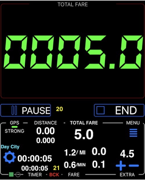 計費器暫停,您可以使用「開始」按鈕恢復行程,或使用垃圾桶按鈕 #22 完全清除/刪除行程。因此,在點擊垃圾桶按鈕前,最好先與乘客結算費用,因為您仍可存取行程額外費用。小提示:給予乘客的折扣可以是負值的額外費用!