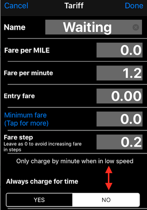 如果需要始終計時收費,請設定「每分鐘費率」,並在費率畫面底部將 「僅在低速時按分鐘計費」 設為 「否」。這將強制計程表始終計時收費。這對於純粹的「等待費率」或需要始終同時計時和計距的情況非常實用。
