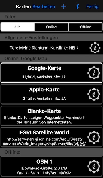Karten in der App sind als Online oder Offline kategorisiert. Integrierte Google- und Apple-Karten gehören zur Online-Kategorie sowie benutzerdefinierte URL-Karten, die Sie selbst hinzufügen können.