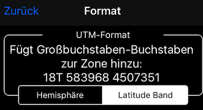 In den Einstellungen> “Koordinatenformat” tippen Sie auf eine UTM-Zeileneinstellungen, um den neuen UTM-Format zu öffnen. Sie können aus “Hemisphäre” (Standard) und “Latitude Band” auswählen: