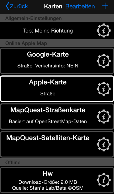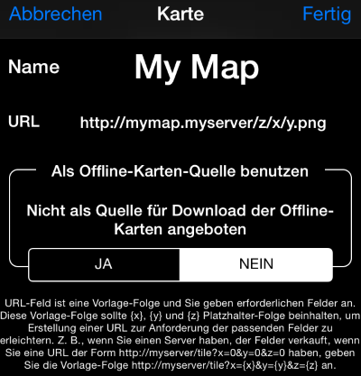 -- Fügen Sie benutzerdefinierte Karten mit {x}, {y}, {z} Feld-URL-Muster hinzu. Tippen Sie auf ein Plus in den Karteneinstellungen, um das Hinzufügen von Karten zu starten.