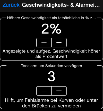 -- Angezeigte und aufgezeichnete Geschwindigkeit kann höher als die tatsächliche eingestellt werden. Hilfreich, wenn Sie dieselbe Geschwindigkeit wie das Tachometer eines Autos anzeigen müssen.