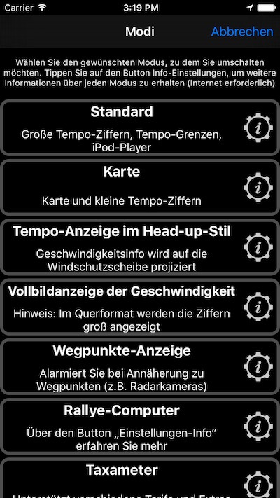 Alle Modi: Standard ▪︎ Wegpunkte-Anzeige ▪︎ Rallye-Computer ▪︎ Taxameter ▪︎ Karte ▪︎ Tempo-Anzeige im Head-up-Stil ▪︎ Vollbildanzeige der Geschwindigkeit ▪︎ Vollbild-Kartenanzeige ▪︎ g-Kraft-Überwachung