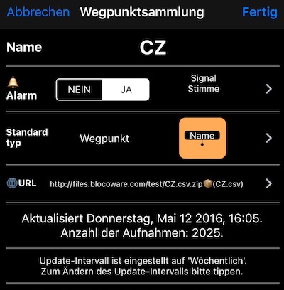 - URL-Sammlungen. Stellen Sie einfach eine URL mit Text- und ZIP-Dateien für POIs ein, dann kann die Speedometer-App diese herunterladen und die jeweilige URL-Adresse regelmäßig auf verfügbare Updates überprüfen: