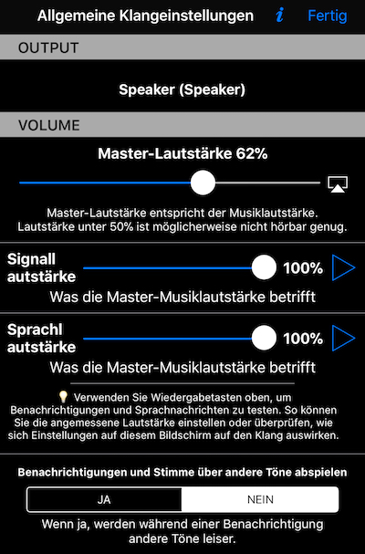 Neu in dieser Version ist der Bildschirm "Allgemeine Klangeinstellungen". Ich hoffe, dass dieser Bildschirm wirklich nützlich sein kann, um Alarm- und Sprachtöne zu optimieren oder mögliche Auto- oder iPhone-Sound-Probleme zu beheben.