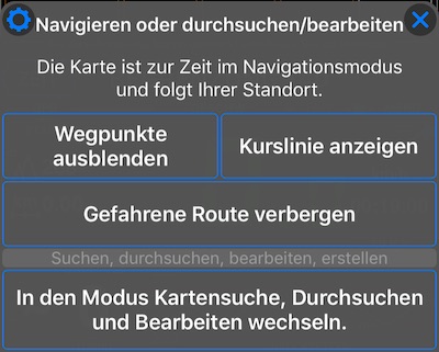 Bitte beachten Sie, dass die automatische Rückkehr zur Zentrierung abgebrochen wird, wenn Sie beginnen, mehr mit der Karte zu tun, als sie einfach zu verschieben. In dem Moment, in dem Sie auf eine Schaltfläche oder einen Wegpunkt tippen, wird diese automatische Rückkehr abgebrochen, wodurch Sie die ununterbrochene Möglichkeit haben, mit der Karte weiter zu arbeiten.