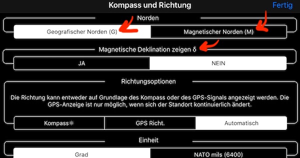 Für den wahren und den magnetischen Norden klar machen - welcher wird benutzt und wie ist die Deklination? Sowohl aktuell, an Ihrem Standort als auch für jeden Punkt auf einer Karte. Standardmäßig ist die Deklination ausgeschaltet und Sie schalten sie in den Einstellungen> “Kompass & Kurs” ein: