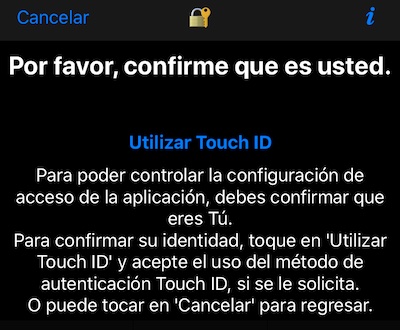 Este paso de autenticación adicional para acceder a la configuración es necesario para evitar que otra persona, no Usted, acceda a la pantalla de configuración y le bloquee la aplicación. Solo por primera vez, se le pedirá que acepte el uso de Face ID para la aplicación (no se harán preguntas adicionales en caso de Touch ID):