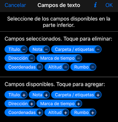 Toque en la fila con la lista de campos y elija qué campos de texto deben mostrarse en la parte superior de la imagen en un informe en PDF o correo electrónico: