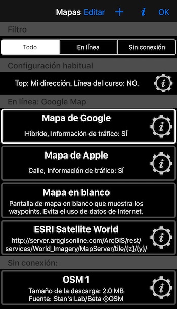 Los mapas de la aplicación se clasifican como En línea o Sin conexión. Los mapas de Google y Apple incorporados pertenecen a la categoría En línea, así como a los mapas de URL personalizados que puede agregar usted mismo.