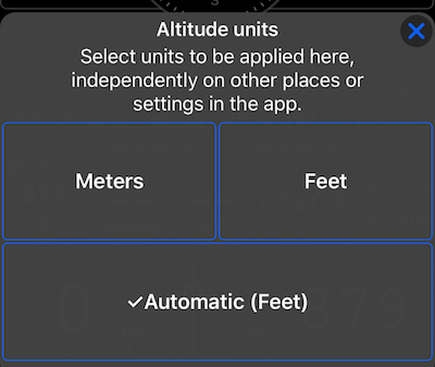 Otra solicitud de los pilotos fue mostrar la altitud en pies o metros, independientemente de otros ajustes en la aplicación. Al tocar debajo de la etiqueta “ALTITUD”, puede abrir la configuración solo para esto: