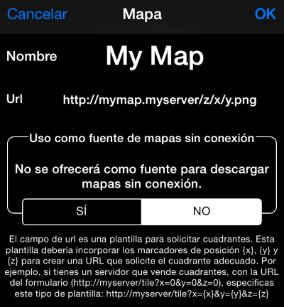 Añade mapas personalizados con patrones de url {x},{y},{z}. Pulsa en el Más de la configuración del mapa para empezar a añadir mapas.