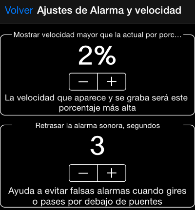 -- La alerta sonora se puede retrasar unos segundos. Puede ayudar para evitar falsas alarmas cuando hay giros o pasas por debajo de los puentes.