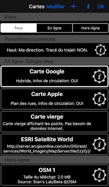 Les cartes de l’application sont classées en ligne ou hors ligne. Construit dans Google et les cartes Apple appartiennent à la catégorie en ligne ainsi que des cartes URL personnalisées que vous pouvez ajouter vous-même.