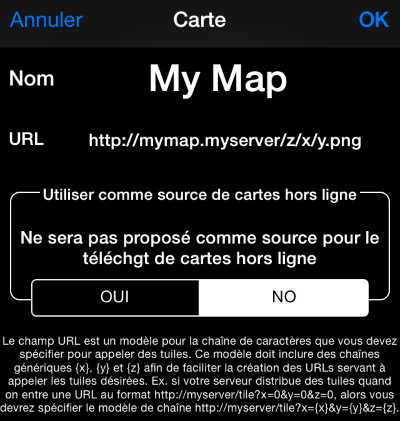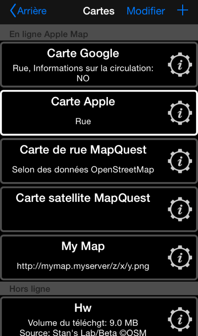 -- Ajoutez vos propres cartes personnalisées à l’aide des modèles {x},{y},{z} d’URLs de tuiles. Pour commencer à ajouter des cartes, toquez sur le signe « + » dans les paramètres de carte.