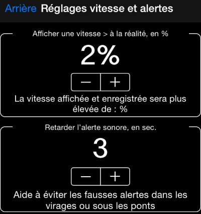 -- L’alerte sonore peut être retardée jusqu’à quelques secondes. Cela peut être utile afin d’éviter les fausses alertes lorsque vous empruntez des virages ou passez sous des ponts. Accessible par le menu « Paramètres avancés » > « Réglages de la vitesse et des alertes »
