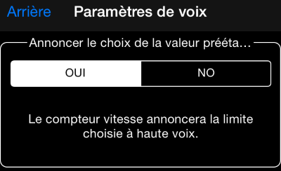 -- Le compteur de vitesse peut vous confirmer à voix haute quelle limite de vitesse a été sélectionnée.