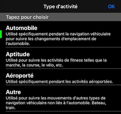 Bien que l’application nécessite à tout moment la meilleure précision du module de localisation, la définition du bon type d’activité aidera le module de localisation sur iPhone / iPad à améliorer encore la précision GPS / localisation. Les facteurs d’optimisation peuvent inclure l’entrée de l’Apple Watch ou de capteurs de mouvement.