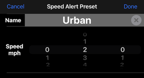 आप किसी भी स्पीड लिमिट प्रीसेट के नाम और मान को आसानी से बदल सकते हैं। बस प्रीसेट बटन को 1 सेकंड तक दबाए रखें, फिर छोड़ दें: