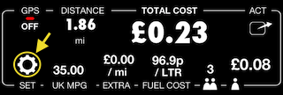 आइए विस्तार से देखें कि लाइव लागत मॉनिटर के लिए यूके MPG पैरामीटर कैसे सेट करें। यूके में सभी पेट्रोल स्टेशनों पर मूल्य अब लीटर के अनुसार है, गैलन के अनुसार नहीं और यह मूल्य पेंस प्रति लीटर में है। लागत मॉनिटर सेटिंग्स खोलने के लिए कृपया लागत डैशबोर्ड में सेटिंग्स बटन पर टैप करें: