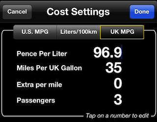 खुले विंडो में UK MPG को चुनने के लिए टैप करें। और ईंधन मूल्य पेंस प्रति लीटर, मील प्रति गैलन में दर्ज करें।