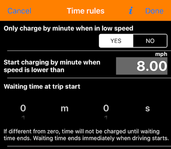 नया “किराए नियम” स्क्रीन भी है। यहाँ आप न्यूनतम या एंट्री/बेस किराए में क्या शामिल है (यदि कुछ है) और बेस/एंट्री/न्यूनतम किराए में शामिल न्यूनतम दूरी पहुँचने से पहले समय किराए का कैसे प्रबंधन किया जाता है, वह परिभाषित कर सकते हैं: