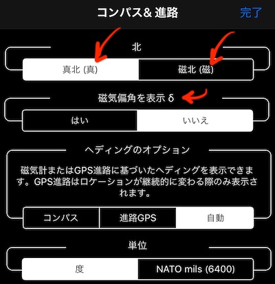 真北と磁北の両方を明確にする - どちらが使用されているのか、またどのようなものがあるのか。 現在地、あなたの所在地、地図上の任意の地点の両方。 デフォルトでは下降表示はオフになっており、設定> “コンパス&コース"でオンにしています:
