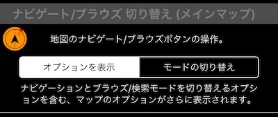 デフォルトでは、このボタンはマップ上のオブジェクトの表示/非表示、「ナビゲート」モードと「検索/ブラウズ」モードの切り替えのオプションを開きます。