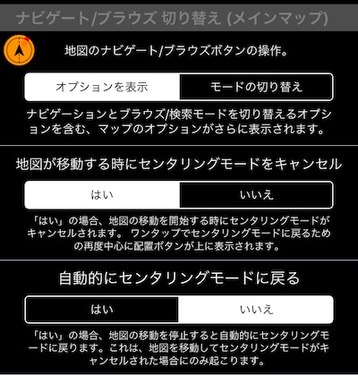 デフォルトでは、マップは移動を開始するときにセンタリングモードをキャンセルし、「再センタリング」ボタンをタップしてセンタリングモードに戻る必要があります。 これを元の設定に戻したり、地図が自動的にセンタリングモードをキャンセルできるようにするには、共通の地図設定を一番下に表示してください。